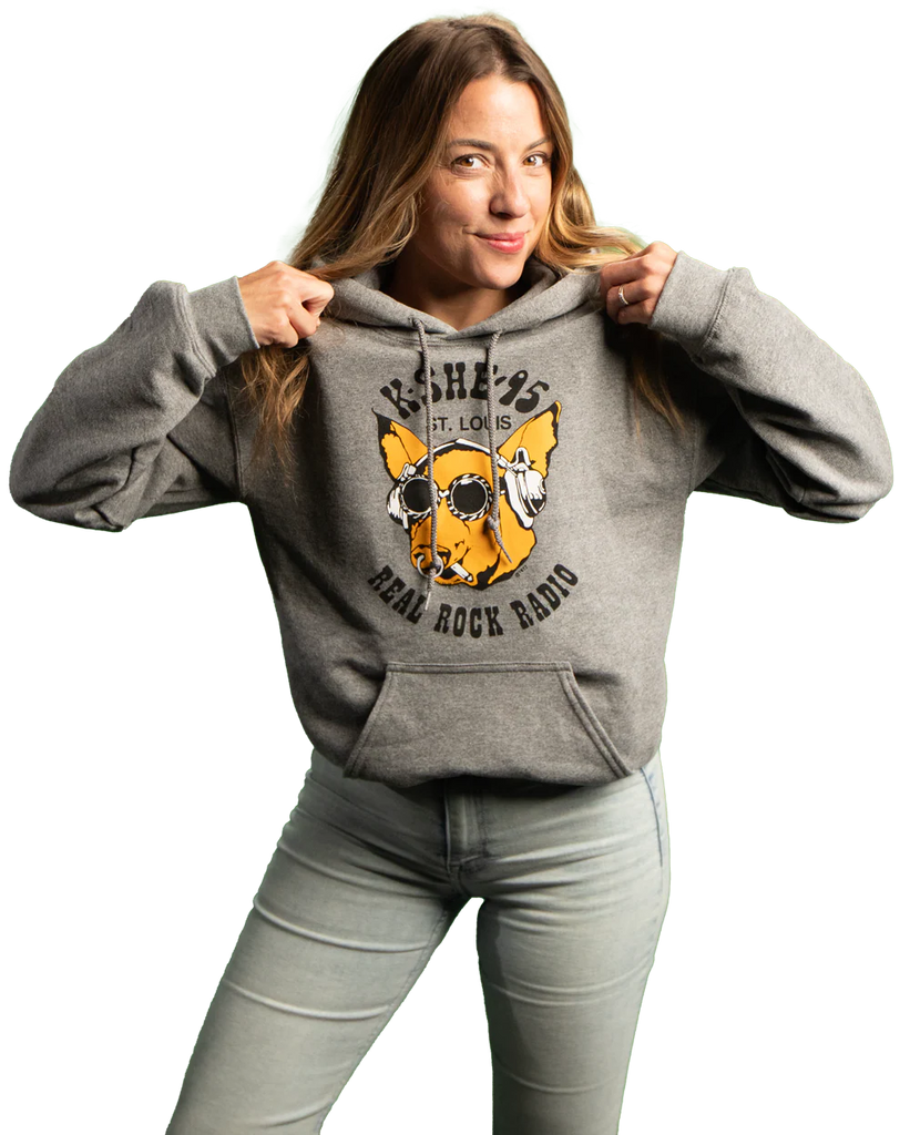 Grey KSHE classic logo hoodie. Gildan Brand, 50% Cotton, 50% Polyester.